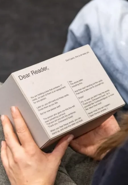 De voorstelling is begonnen. Ontroerend Goed geeft jullie in Handle with Care de volledige controle. Wij zorgen voor de structuur, jullie voor de invulling. Je kiest zelf je aandeel: neem het voortouw of observeer hoe anderen keuzes maken die de voorstelling in onverwachte richtingen stuurt. Zo creëren jullie samen een bijzondere ervaring, vol bespiegelingen over tijd, eindigheid, en samen zijn. En wees gerust: in Handle with Care bestaan geen verkeerde keuzes. Jullie gaan dat sowieso goed doen. Een uur lang beleef je iets unieks, eenmalig en onherhaalbaar. Hier. Nu. Samen. Niemand kijkt mee. Wat van jullie is, blijft onder jullie. Zorg er goed voor. En stuur ons een kaartje.