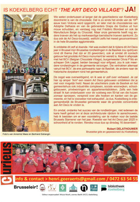 Georganiseerd door Manne van de PlatouWe weten ondertussen al langer dat de geschiedenis van Koekelberg doordrenkt is van de chocolade. Dat is zo sinds het einde van de 19de eeuw toen Victoria werd opgericht, en later met de chocolateries van Adolphe Delhaize en van de gebroeders Draps die Godiva uit hun mouw schudden, en vandaag nog met Frédéric Blondeel en ook de Manufacture Belge du Chocolat. Maar onze gemeente heeft nog andere troeven als het op merkwaardige toeristische troeven aankomt. Zo dus ook de Art Deco-bouwstijl, wellicht zelfs het meest geconcentreerd in de hele Brusselse agglomeratie. Ik ontdekte dit zelf al doende. Het was evident dat ik tijdens dit Art Deco jaar in Brussel mijn Brusselse rondleidingen in de Basiliek zou opdrijven rond dit thema (het zijn er 20 geworden), ook al omdat dit iconisch gebouw het grootste Art Deco monument ter wereld is. Maar in afspraak met het BCV (Belgian Chocolate Village), burgemeester Olivia P’tito en schepen Dirk Lagast, beiden bevoegd voor erfgoed, zou ik ook meerdere rondleidingen in de gemeente verzorgen. Die vertrokken allemaal vanuit het BCV, de ene parkwaarts naar de Basiliek, de andere naar de historische dorpskern rond het gemeentehuis.