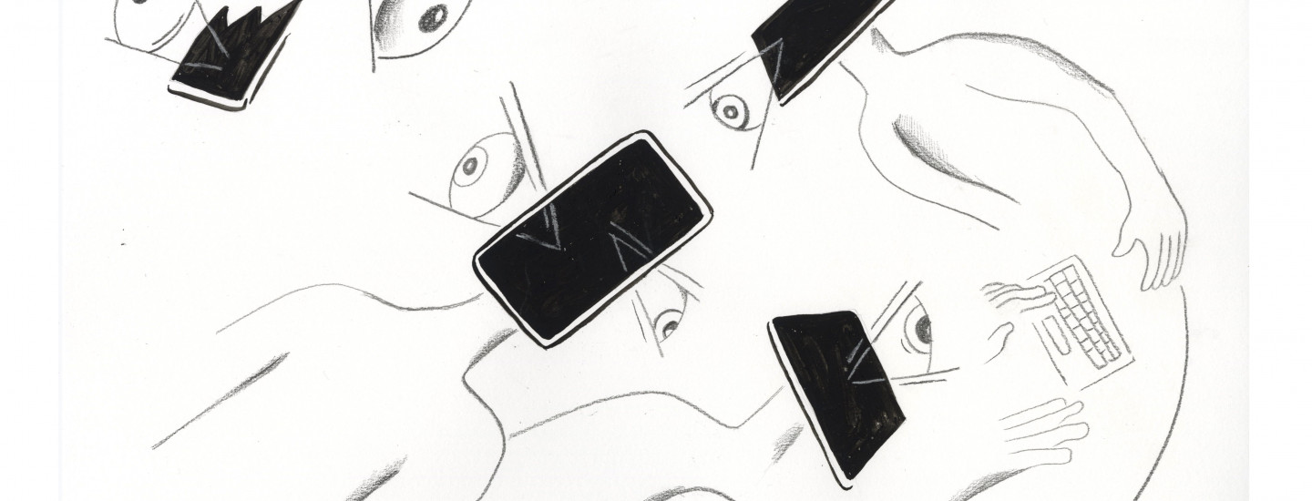 Dat kleine momentje van existentiële scherpte overviel me op een doordeweekse ochtend, zittend in de tram richting het werk. Na een stevig potje doomscrollen keek ik uiteindelijk op van mijn telefoon. Niets in het bijzonder had mijn aandacht getrokken. Ik keek om me heen en zag een vertrouwd beeld: iedereen rondom mij zat ook op zijn telefoon. Bij wijze van spreken neusdiep in het scherm, koptelefoons om het hoofd en de nek ver voorovergebogen.